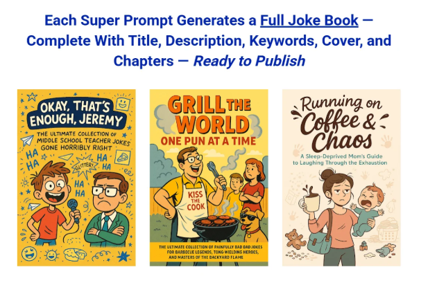 Each Super Prompt Generates a Full Joke Book — Complete With Title, Description, Keywords, Cover, and Chapters — Ready to Publish