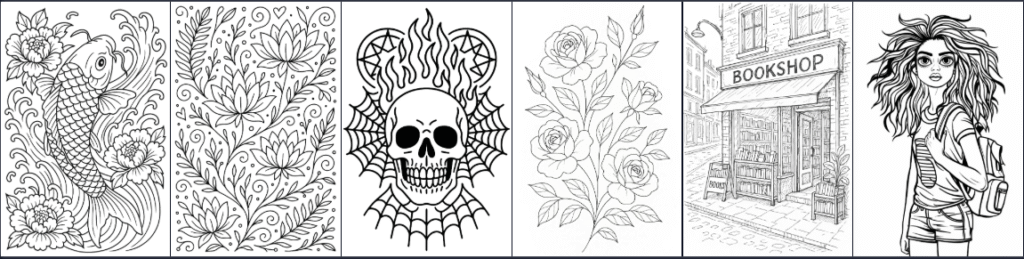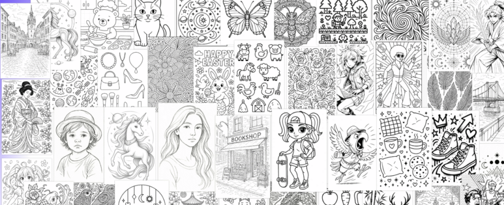 Generate kids’ books, adult relaxation books, mandala series, fantasy collections, kawaii doodles, floral geometry, tattoo art, or pixel art in seconds.