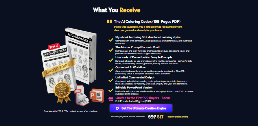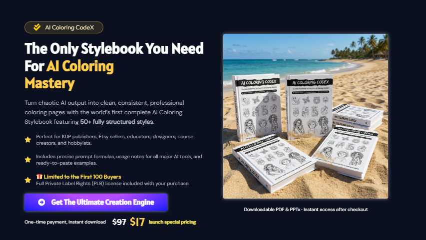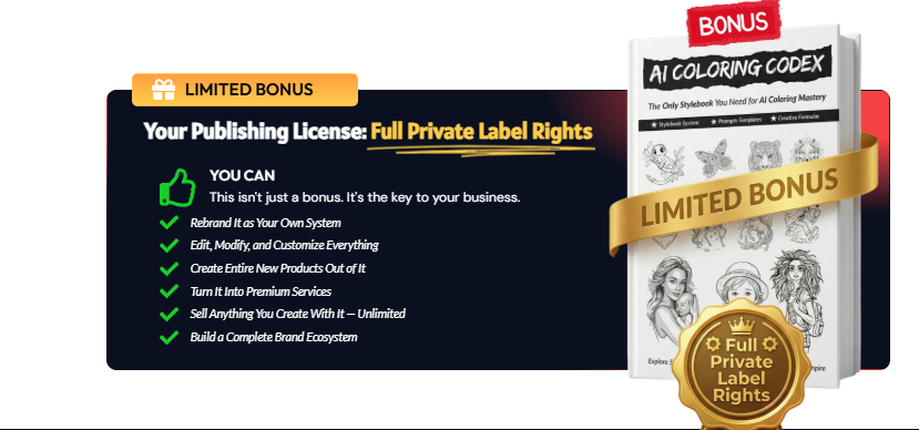 AI Coloring CodeX also comes with a rarity in the digital publishing world: Full Private Label Rights (PLR) for the first 100 buyers. This means USA creators can rebrand the system, sell the stylebook as their own digital product, or build full coloring book series under their brand. Combined with optimized workflows, instant download, and unlimited commercial usage, this is possibly one of the most powerful USA-market publishing tools released in 2025.