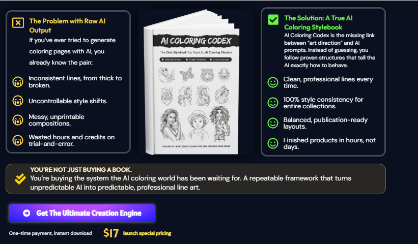 AI Coloring CodeX is a game-changing 158-page system designed to help creators, publishers, Etsy sellers, and AI designers generate consistent, professional, and high-quality coloring pages using any major AI tool. Unlike random prompt packs or template bundles circulating online, this system solves the biggest real-world problem in the USA coloring book market — style consistency across full KDP books and printable packs. With KDP competition at an all-time high, creators need predictable, clean, print-ready output. CodeX finally makes that possible.