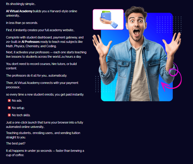 This revolutionary platform lets you set up your own self-running school in minutes. No teaching, no content creation, no marketing — just activate your academy, and let AI handle everything from lessons to payments. Whether you’re a beginner or an experienced marketer, this system creates a new stream of passive income while positioning you as the “Dean” of your digital university.