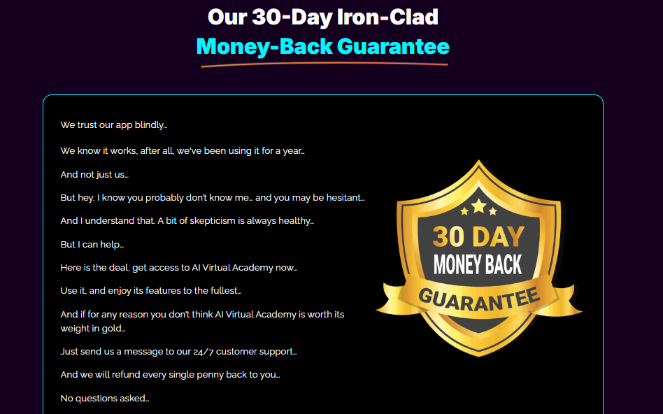 The team behind AI Virtual Academy provides round-the-clock support to ensure smooth onboarding and usage. And if you’re not satisfied, you’re fully protected with a no-questions-asked refund policy.