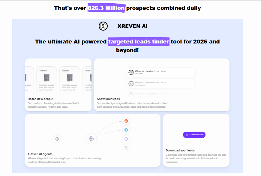 XReven AI is a revolutionary AI-powered lead-generation platform that scans millions of active buyer signals across platforms like Reddit, Quora, Facebook, and LinkedIn — helping you instantly identify and contact people who are actively looking for your offers. It’s like having a personal sales assistant who never sleeps, never misses an opportunity, and finds you real, converting buyers every single day.